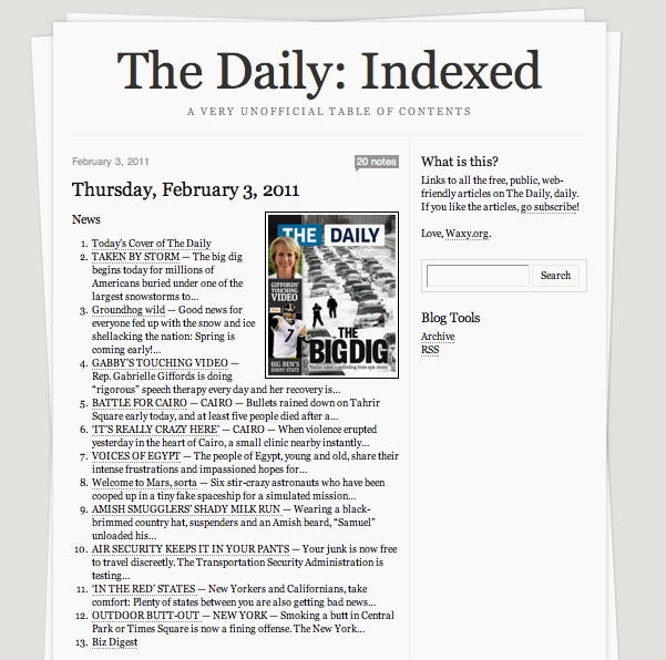 One thing about The Daily that bugged me from the second I first laid eyes on the iPad newspaper that launched yesterday is that there is no one place where you can see a simple list of every story in the issue. There is a table of contents, but it shows only ten featured stories. Like any good hack, The Daily: Indexed creates a feature that is missing from the original but is deeply needed. The Tumblr blog put together by Andy Baio creates a complete table of contents for The Daily.