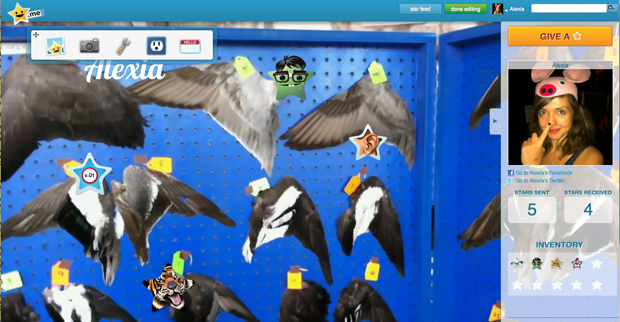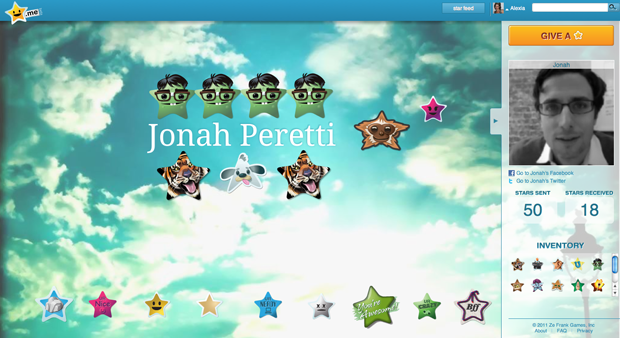 On Star.me you, as a consenting adult, can chose to give out themed Stars with messages like “UR CRAZY,” “UR CUTE,” “BFF,” “Frenemy,” “Bromance,” and (!) “Mom Jeans.” Both the actions of giving and receiving Stars cause new and more diverse stars to be unlocked and obviously, more people sending stars in your direction. Your objective is to give and to get others to give to you through a series of transactions, Games People Play style. Sort of like life (Hint hint, things tend towards reciprocity).