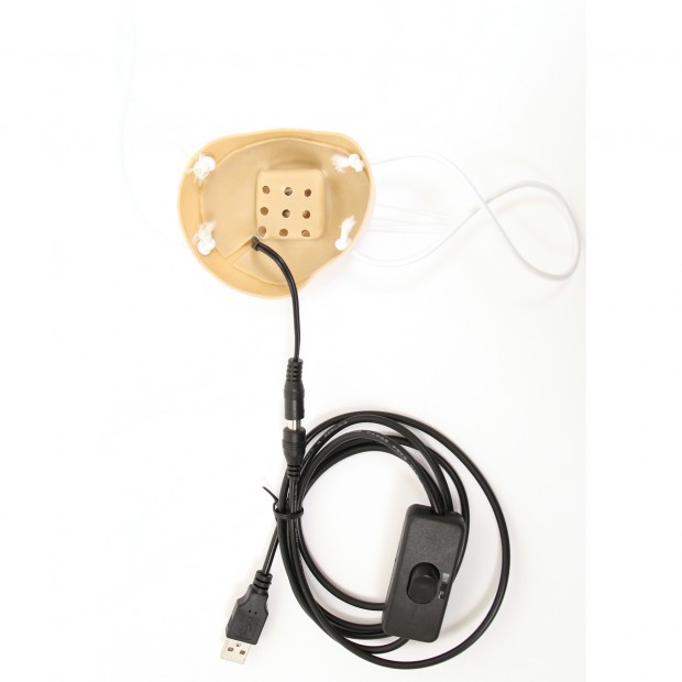 The fan is supposed to make you breathe easier (?) and is powered by USB (I guess you need to figure out a way to hide the USB cable and stay connected to a computer when using the thing).