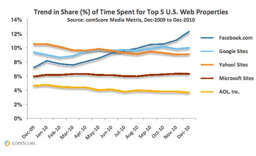 Facebook has even surpassed Google, Yahoo and Microsoft in terms of time spent on each site, according to comScore’s data. Hitwise’s data also showed that Facebook was the most visited website in the US in 2010, beating out Google and others.