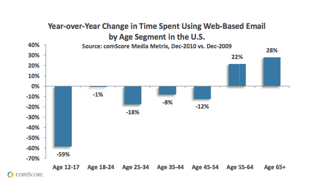 Usage was also down 1% among 18-24 year olds, 18% among 25-35 year olds, 8% among 35-44 year olds and 12% among the 45-54 demographic. Because oldsters are continuing to migrate online in droves, web email use actually saw an uptick in the AARP-eligible sector, with 22% gains among 55-64 year olds and 28% among those 65 and older. Obviously this was not enough to offset the decline in youth usage.