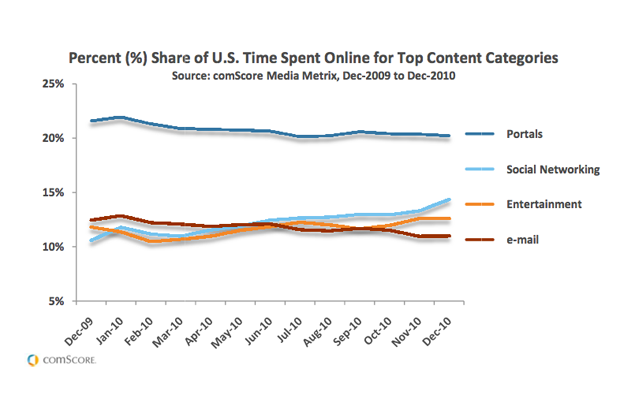 Young people are simply spending more time social networking than anything else, up 3.8% to 14.% of all time spent online. In contrast, use of web -based email lost 1.5% at a total of 11% of time spent.