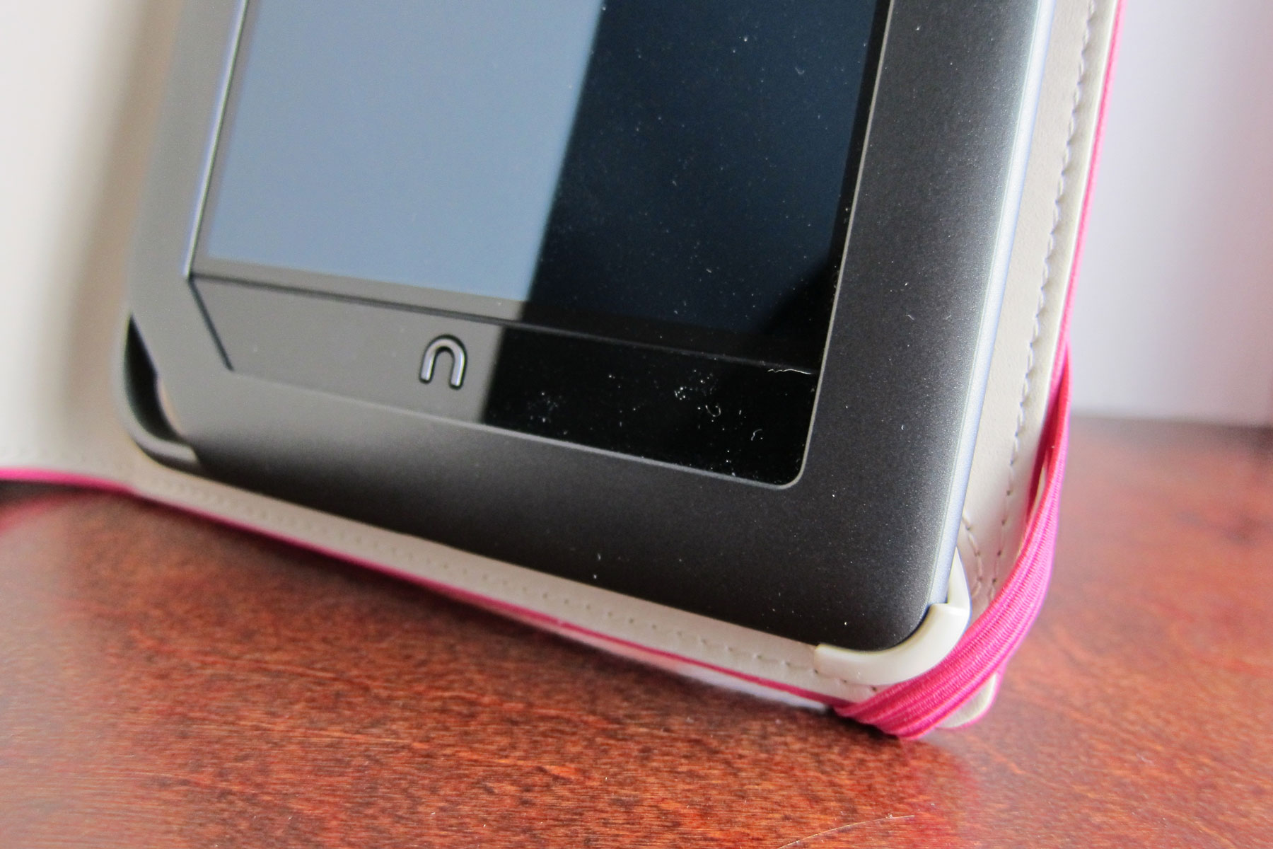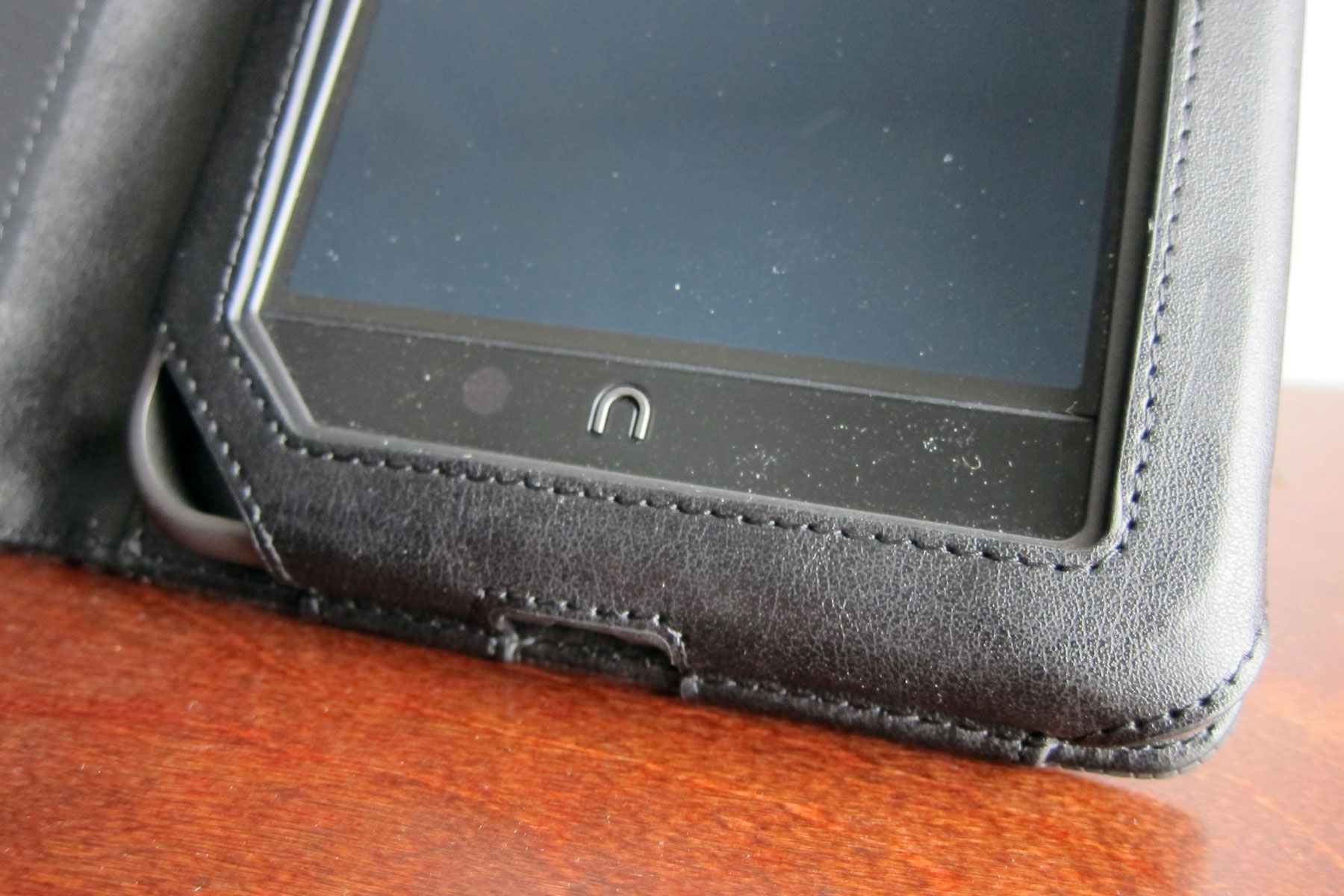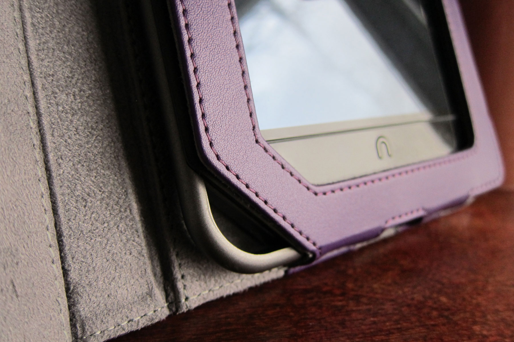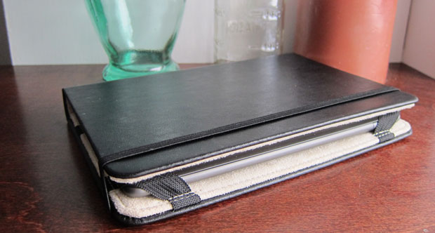 Full-grain leather on the outside and faux suede on the inside. There’s no pockets or card holders or general nonsense; just a quality case for the Nook Color. Little plastic tabs hold the device in place, which results in a clean look. Like other case secured with an elastic band, I’m worried that it will wear out before the rest of the case, but at $35.99 you’re not exactly invested all that much.