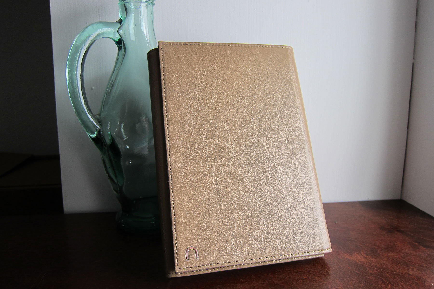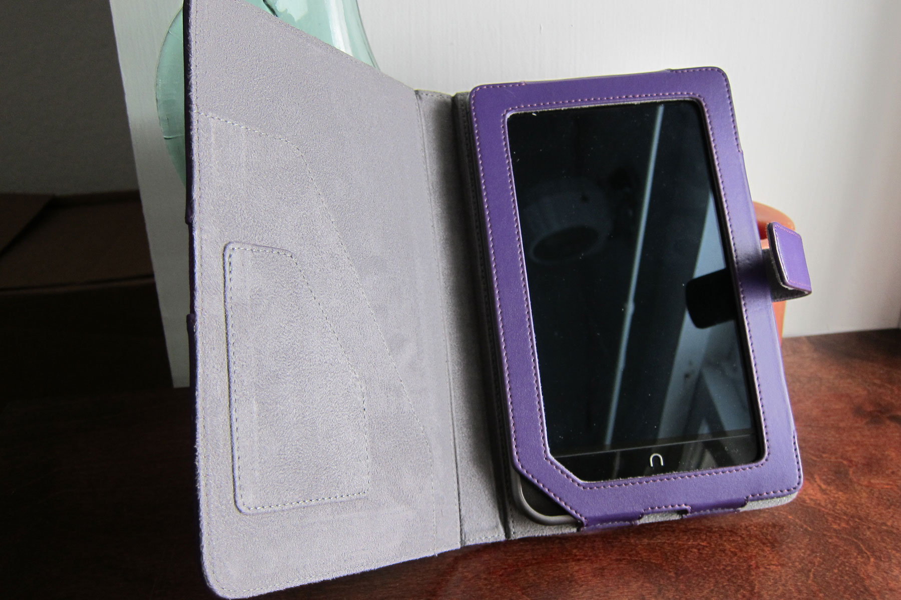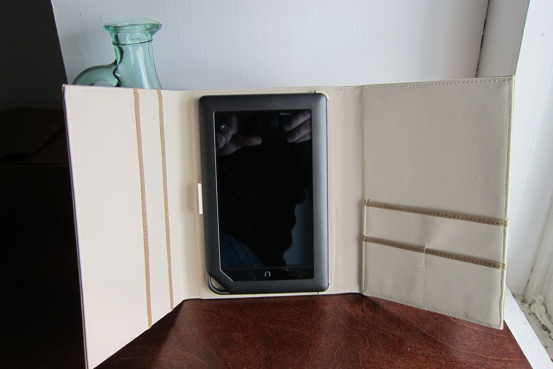 Full-grain leather on the outside and faux suede on the inside. There’s no pockets or card holders or general nonsense; just a quality case for the Nook Color. Little plastic tabs hold the device in place, which results in a clean look. Like other case secured with an elastic band, I’m worried that it will wear out before the rest of the case, but at $35.99 you’re not exactly invested all that much.