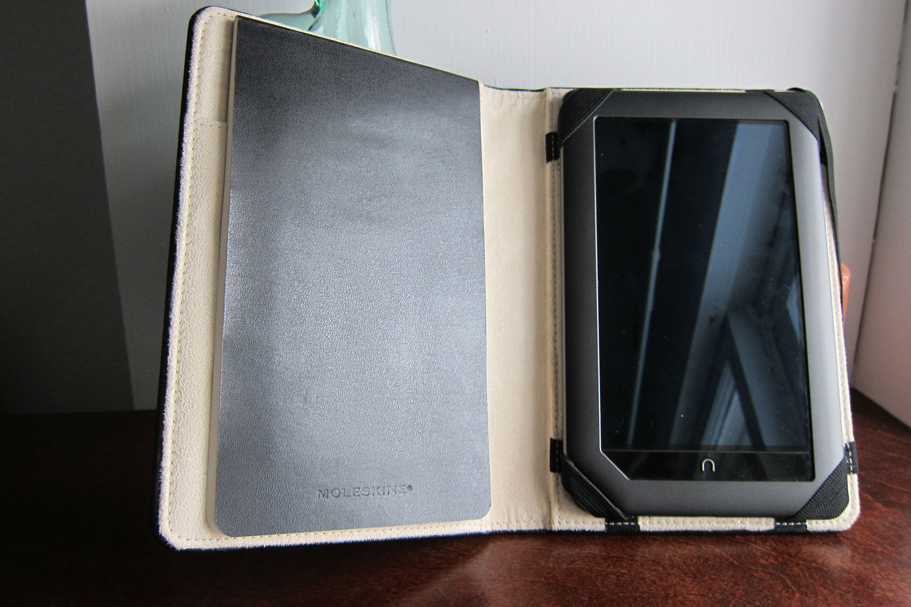 We looked at the Moleskine e-Reader Cover for the Kindle 2 yesterday and determined that the Kindle 3 just doesn’t fit right. But the Nook Color fits perfectly. In fact, this case is one of the best made out of the bunch and a fantastic deal at $39.95. It’s a tad bit thicker if a Moleskine Volant Notebook is on the other flap, but the added functionality counters the bulk.
