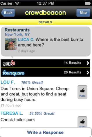 Social Q&A services are springing up everywhere because often search is too cumbersome or imprecise to answer our questions. This is especially true on mobile phones. A new iPhone app called Crowdbeacon attempts to answer your questions with a local twist. It is designed to answer questions about restaurants, shopping, services, and activities in your immediate vicinity. The answers come from other users, local experts, and business owners, as well as Foursquare tips and Yelp reviews.
