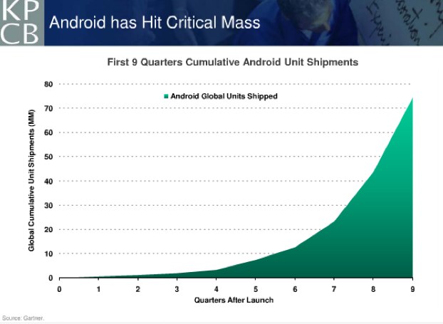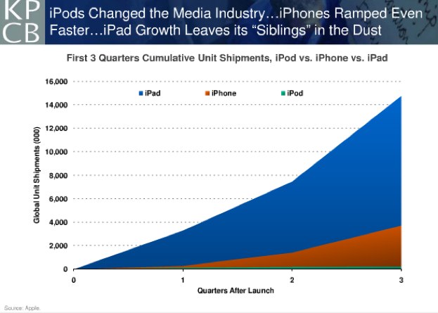 But in particular the first three slides are real eye-openers. The first one shows the acceleration of mobile device adoption from the iPod to the iPad. In the first three quarters after the introduction of the iPod, 236,000 units were shipped. When the iPhone came out, it hit 3.7 million units shipped in its third quarter, but then the iPad blew both of its predecessors out of the water with 14.8 million devices shipped.