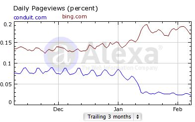 Comscore shows much the same mirror effect. Bing added 138 million more page views worldwide in January than December, and Conduit lost 165 million in the same period.