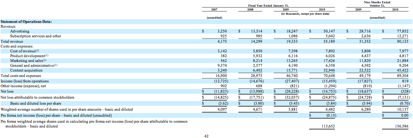 About 86 percent of Pandora’s revenues ($78 million) comes from advertising, the rest ($12 million)comes form subscriptions. Pandora grew revenues 187 percent in the first nine months of 2010 (through October 31), a growth rate that slightly exceeds the 185 percent revenue growth in fiscal 2010 (which was really 2009, plus January). It spends half of its revenues on “content acquisition,” or per-stream music licensing. As of October 31, 2010, it still had $41 million in cash.