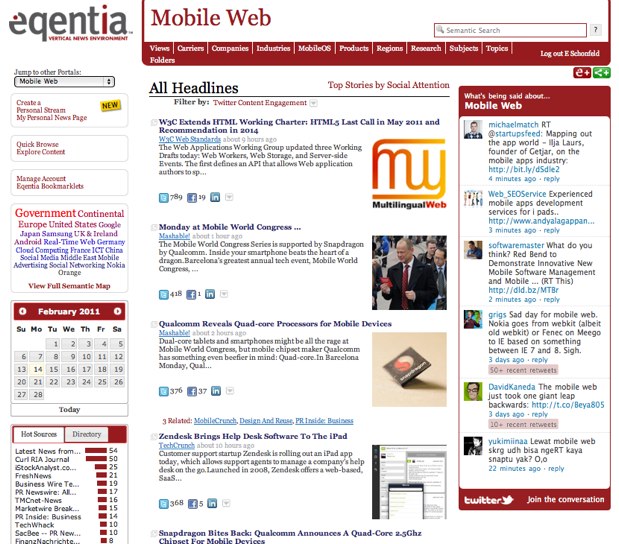 What you get is a personal news page organized by topics and sub-topics that you want to follow (business, technology, iPad news, mobile web, cloud computing). Headlines can be sorted by time, social attention, or preferred sources. Eqentia is designed to create a competitive intelligence dashboard were you can create essentially an alerts page for specialized news about any micro-topic, but these also roll up into broader topics. Each topic page shows recent tweets about that topic in a sidebar widget. The news search is also pretty powerful because of all the implicit categorization and content mining that Eqentia does.