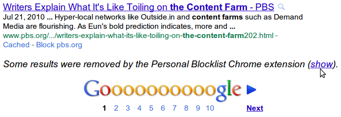So Google is basically crowdsourcing their content farm detecting algorithms by soliciting user feed back to study as a “potential ranking signal” for search results. Hmmm … This is an odd move on Google’s part, as users will still have to find the extension (not everyone reads tech blogs), opt in and consistently edit their results to offer any kind of valuable data. There is also the possibility that rival content farms can use the tool to sabotage each other.