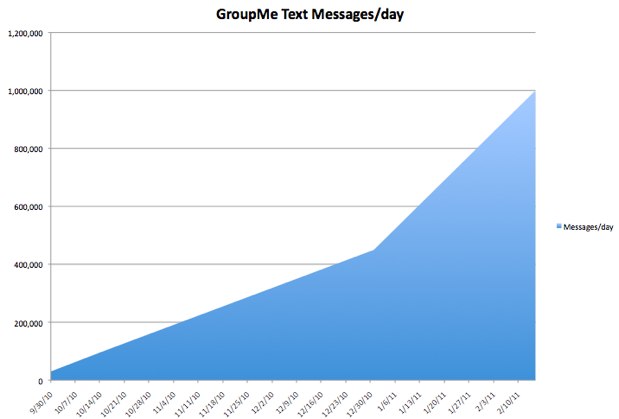 Call it the anti-Facebook effect, but this private group text messaging thing is starting to get some serious traction. The chart above shows the growth in text messages per day going through GroupMe, the group chat startup that launched last May at the TechCrunch Disrupt Hackathon. By the time our San Francisco Disrupt came around in September, GroupMe had reached its one millionth cumulative text message, and was doing about 30,000 text messages a day. Fast forward to today, and it is now doing one million text messages per day.