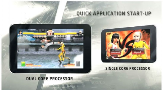 At the 1:00 mark in the official Optimus Pad promo video, there’s a not-so-quick segment that shows Spec Fighter, a take on Street Fighter, where the Optimus Pad fights the “A pad” whose virtual fighter’s likeness is quite similar to Steve’s. You know, the greying beard, balding head, and wire-frame glasses hiding his kind eyes. At least the video wasn’t a Mortal Kombat clone complete with the Finish Him! moves. No, ol’ Jobs just gets a foot to the face Anderson Silva-style. The video is harmless, but will no doubt cause the Apple loyalists to rise up in the name of their leader. Click through for the action.