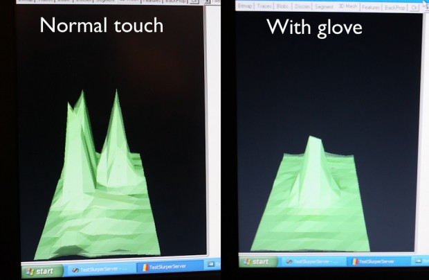 The demonstrators showed how you could wear golf gloves and still interact with it normally, poke at it with a stylus or even a pin, and even stacked 10 business cards on the screen and showed how it could still detect touches. This could really make for improved usability, even new features like easy stylus-based input that doesn’t compromise normal capacitive operation.