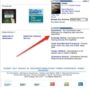 Starting Monday Forbes started to delete the links from their site. We’ve been watching these links come down, but they seem to have forgotten one page. See the bottom right of this page for paid links to Netsuite, AppRiver, Bluepay, SquareSpace and others, all with very nice descriptive keywords like “ecommerce,” “Create a Website,” etc. Previous links to Siemens and AT&T were prevalent, and those links still appear on eWeek and CIO Magazine.