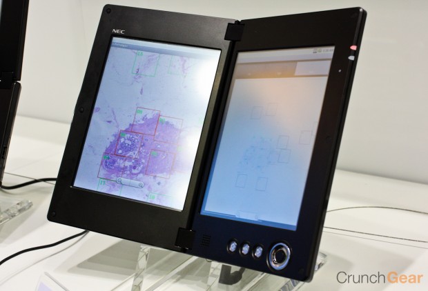 The dual-screen Android device NEC showed off at CES wasn’t exactly a crowd-pleaser. Without the latest version of Android, and sporting a rather low five hours of battery life, there wasn’t much to get excited about. But I like the idea of two discrete screens a la the Entourage Edge and the ill-fated Courier. NEC decided it’s an interesting form factor for medical software, of all things. They’ve made a special version of an app called e-Pathologist that lets oncologists browse high-res images at the same time as diagnosis and treatment information.