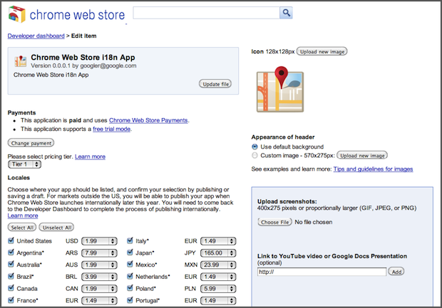 If you are using Chrome Web Store Payments to charge for your app, you will also be able to set the app price for each country although if you’re not based in the United States you will not be able to complete your merchant account sign up just yet (this will be enabled soon).