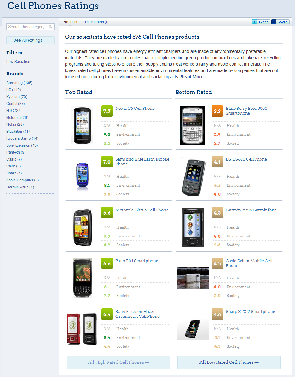Unlike other sustainability reports on mobile phones — like the O2 Ecoratings in the U.K. market, or Greenpeace’s Guide to Greener Electronics — GoodGuide reported environmental and social impact as separate scores, offered company and product-level scores, and provided information about phones’ radiation levels (not counted in their scores) for consumers who believe this could pose a health risk.