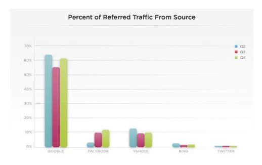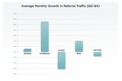 In terms of growth rate, Yahoo and Twitter both showed dwindling growth rates. Facebook is growing the fastest in terms of referral traffic followed by Bing and Google.