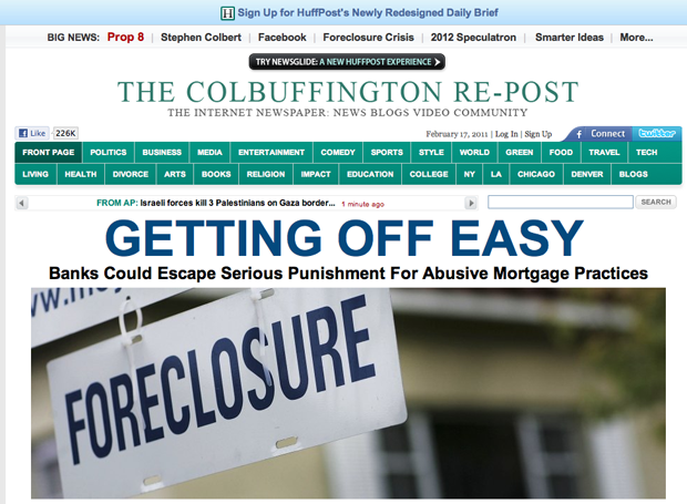 Har har indeed, except that when you actually visit TheColbuffingtonRepost.com, it truly serves up an exact copy of The Huffington Post with Stephen Colbert’s Colbuffington Re-Post logo. a) I’m not sure this is even legal. b) Just wait ’til Arianna gets a load of this.