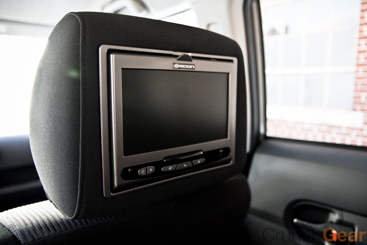 In the back seat we found two 7-inch LCD monitors mounted in the front headrests that offered DVD playback. Again, these aren’t connected to anything else in the car, the DVD player is built into each monitor. So for $1599 you can have two different movies going. Quality wasn’t bad on the monitors, but we’d pass on that option. We’d recommend getting two iPads with rear seat mounts — who watches DVDs anymore.