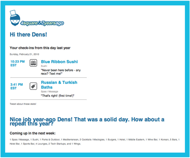 From the folks that brought you FlickSquare now comes 4SquareAnd7YearsAgo, a simple app that emails you with a reminder of where you checked in on Foursquare a year ago. All you need to do is sign into the app on FourSquare and the app will email you with last year’s checkins. That simple. And if you didn’t check-in on any given day the email skips.
