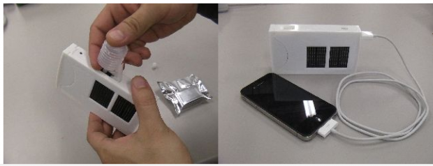 According to the maker, the cell generates 3W and needs 90 minutes to charge an iPhone (which is enough to use the handset for about three hours). To make the device small and light (128g), Aquafairy used calcium hydrate. Users add water to the hydrate to generate hydrogen gas, which then reacts with oxygen to generate electricity.