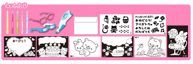 The way it works is pretty simple: just place a pen with the color of your choice in the battery-powered main unit and start creating images, for example on one of the cute greeting cards Sega throws into the package (see below). 3D glasses are required to view the images “in 3D” – you know, for the kids.