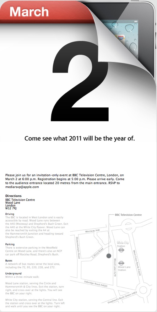 Let the speculation begin. The BBC is holding an event next week, on the same day and exactly the same time that iPad 2 is to be announced. The Apple event starts at 10am PST and the BBC event starts at 6pm GMT (which are exactly the same). If true, it looks like there could be some video chatting between the two companies from across the pond.