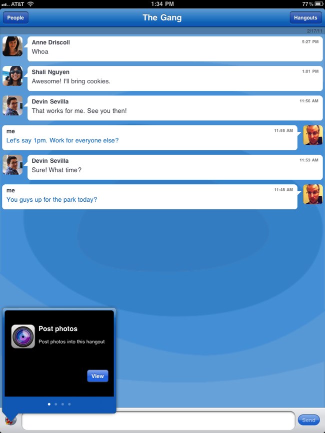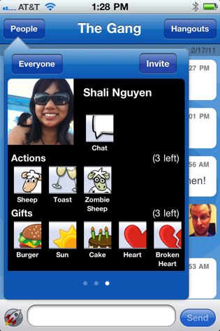 For one one on communications it works a lot like text messaging, albeit with a synchronous flow that makes it more fun to use. In group hangouts, though, it really shines. If you want to have a quick group chat with some friends or coworkers from your mobile, this is something you’ll enjoy using. You can also post pictures and videos, give gifts, and do fun stuff like throw zombie sheep at each other.