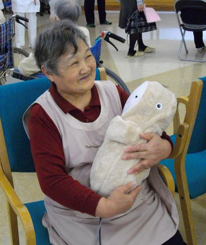 Babyloid inventor Kanou Masayoshi says his robot can, by simulating certain human emotions (i.e. crying/see above), trigger emotional responses in users, something that may be helpful to fight symptoms of depression especially seen with the elderly.