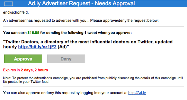 And while Sheen is in the Ad.ly network, which means that Ad.ly is mining his follower data to present to advertisers for tweets, he as of yet has not become a publisher, (“we have no plans right now”) which means sending out a lucrative tweet endorsement. Ad.ly tweet endorsements run anywhere from $1000-$20,000 depending on the celebrity Rad told me. For the less famous members of the Ad.ly network, like our own Erick Schonfeld, those numbers are less underwhelming.