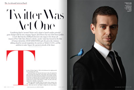 Jack Dorsey gets the Vanity Fair treatment in a long profile written by David Kirkpatrick (author of The Facebook Effect). It goes over familiar ground for anyone who’s been following Dorsey—his obsession with maps and cities, the founding of Twitter, his ouster, and more recently new company Square (which is doing just fine, thank you). But Kirkpatrick pulls it all together into a cohesive narrative peppered with some new details.