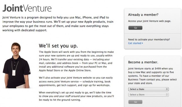 Apple has officially launched its JointVenture support for small businesses. Support comes from the Apple store and will be provided by the Apple Genius Bar. The plan is only available to business customers when purchasing a Mac, but the $499 service will include training and support for up to five “systems,” which include iOS devices and Cinema Displays.