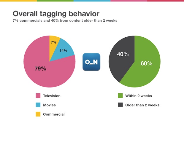 Of the IntoNow users, 79 percent are using it for television content versus 14 percent for movies. That shouldn’t be too surprising either though given that IntoNow only focuses on older movies for the time being. More interesting is that a full 7 percent of tags are used to tag commercials.