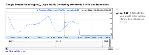 Interestingly enough Libyan traffic to YouTube, a service popular with dissidents, had been increasing right before the shutdown according to Google. This shutdown comes ahead of planned protests in Tripoli calling for the ousting of Libyan leader Muammar Gaddafi.
