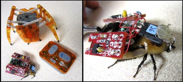 Some aspiring Dr. Frankensteins have taken the circuitry from a Hexbug remote control critter and grafted it directly to the nervous system of a large cockroach. They can now steer the cockroach.