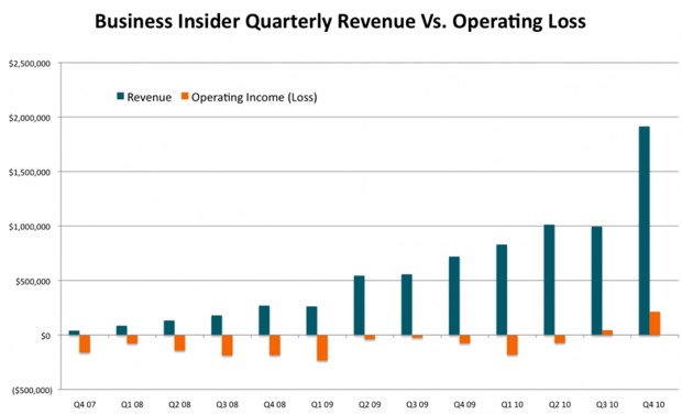 But that’s actually quite an achievement for a media startup. Remember, the Business Insider was founded only in 2007, and this achieved profitability in its third year of operations. And as you can see by the chart above, its really the revenues that you want to keep an eye on. To put that $4.8 million in perspective, that’s roughly half of TechCrunch’s 2010 revenues of $10 million. Not bad. Most of last year, the Business Insider was pulling in about $1 million a quarter, which then almost doubled in the fourth quarter (I’m guess that bump came from its big conference).