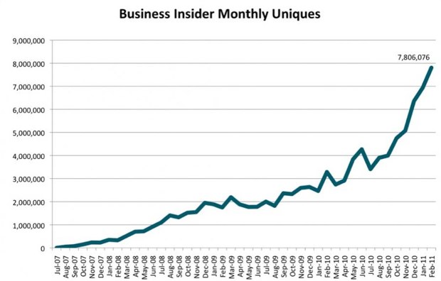 Some other stats to chew on: The Business Insider now has 45 full time employees, and according to its internal numbers is attracting a 7.8 million unique visitors a month across its properties (which include Silicon Alley Insider, The Wire, and Clusterstock). ComScore has Business Insider at 4.6 million worldwide unique visitors in January, but also shows the same growth trend. SAI is now “less than half the total,” Blodget tells me. It looks like growth really took off in the past six months.
