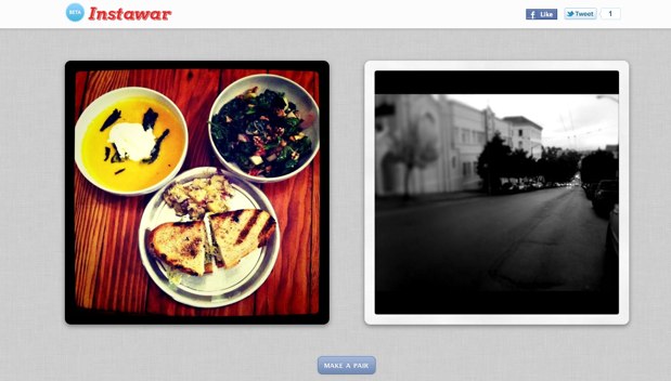 Instawar shows you two random Instgram pics and lets you choose which one is better. It’s like Pic A Fight. If you like a pairing you can create a link (like this one) and share it via Twitter or Facebook.