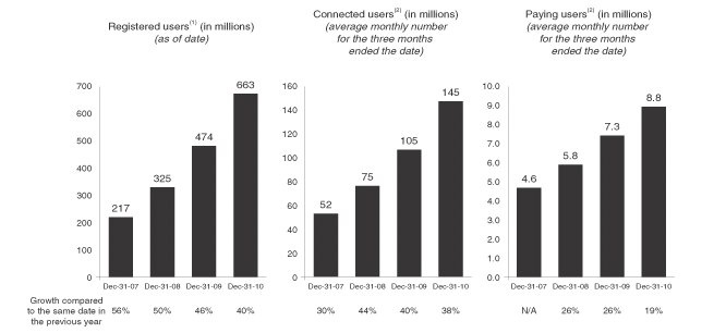 Skype says that it has grown its average monthly connected users by 38% (to 145 million average monthly connected users) and has grown average monthly paying users by 19%, from the three months ended December 31, 2009 to the three months ended December 31, 2010. Average monthly paying users have increased from 7.3 million to 8.8 million users, and Skype is seeing an average of $97 in revenue per paying user. From December 31, 2009 to December 31, 2010, Skype has grown registered users from 474 million to 663 million users.