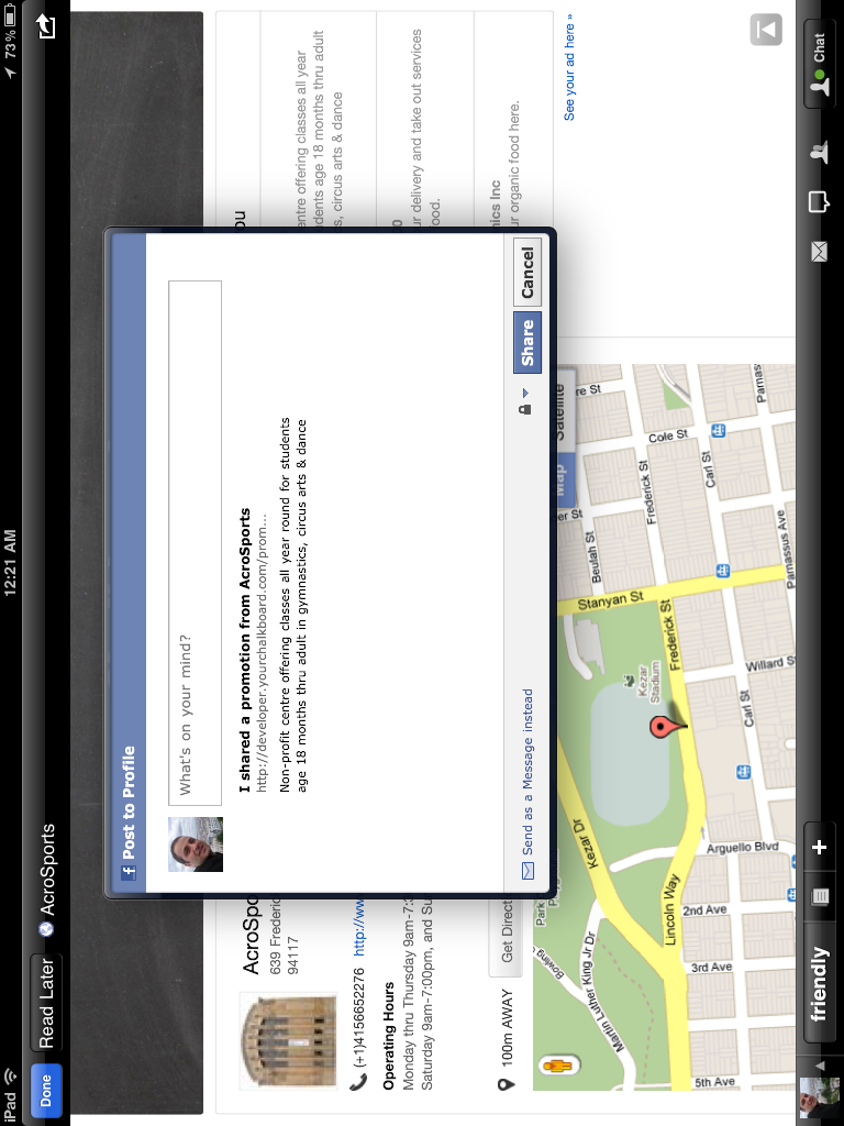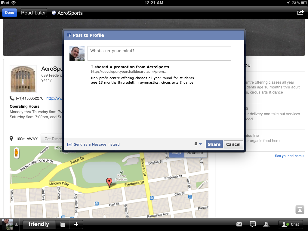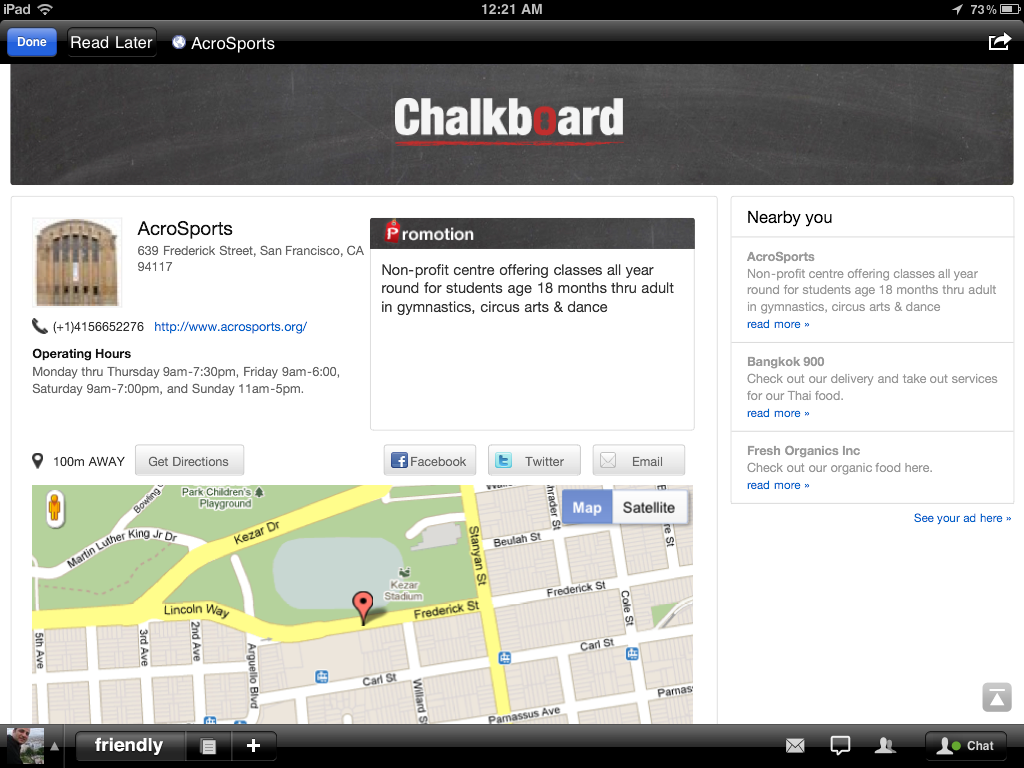 Users can click on the ads to view the promotion, access maps/directions or share the information with their friends on Twitter and Facebook. Here’s how an ad/promotion delivered via Chalkboard typically looks: