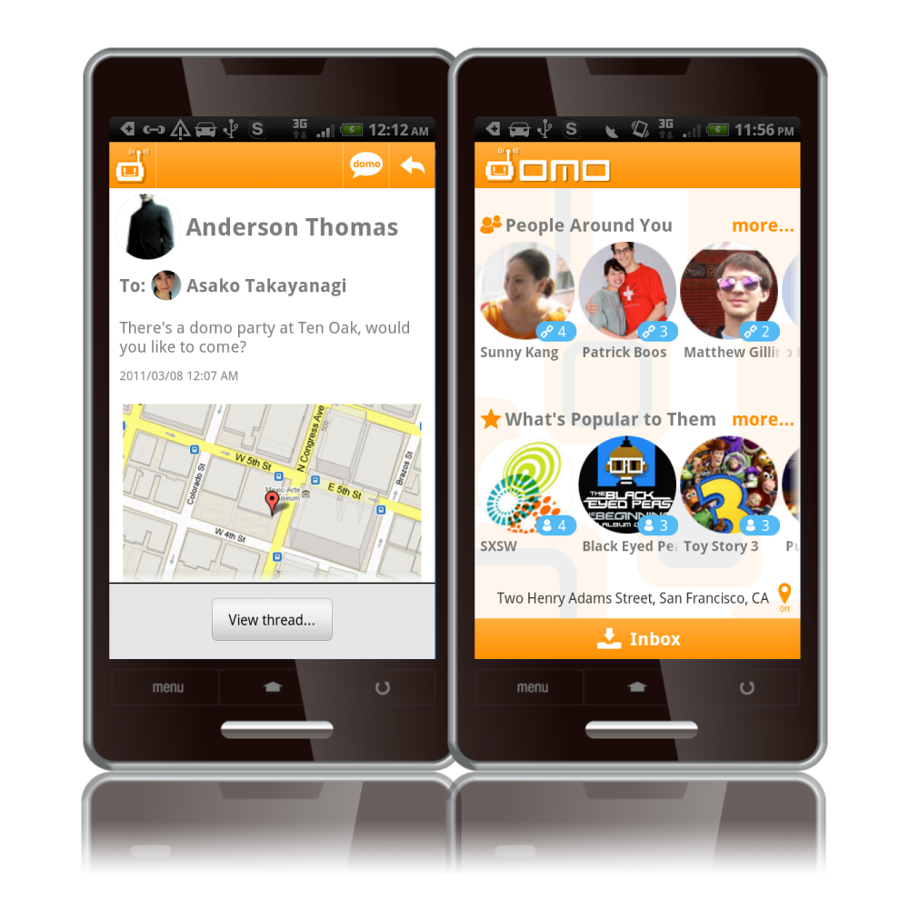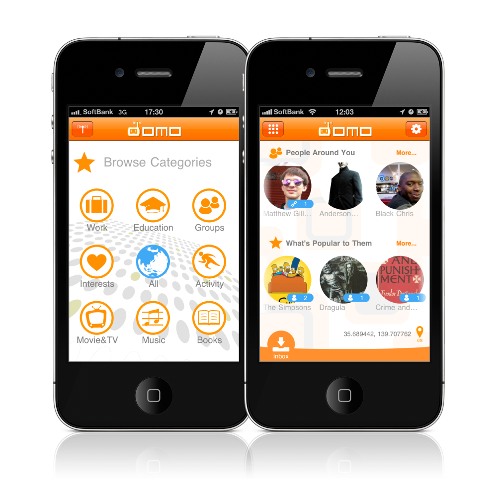 DOMO is being offered as a “pre-social” app, which makes use of your interest graph and location to make it easier to connect with people who are similar to you and physically near you (“pre-social”, because these people are initially strangers).
