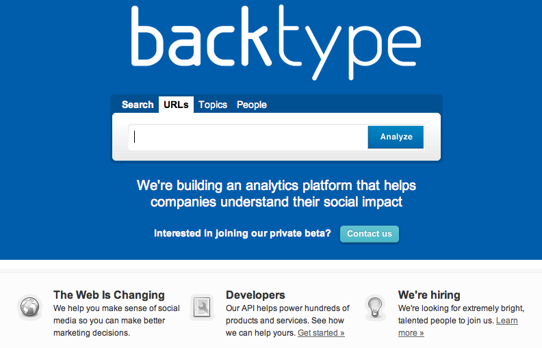 BackType’s free analytics dashboard, which is currently in private beta, aims to help brands and agencies understand the business impact of social media in order to make more intelligent marketing decisions. The company has already amassed 30 terabytes (one terabyte is roughly equivalent to the entire contents of a large library) of social data (Tweets, Facebook comments and likes, blog comments, etc.) and assists more than 100 companies with their social media analytics, from The New York Times and Edelman to startups like Bitly, HubSpot, Hunch and SlideShare.
