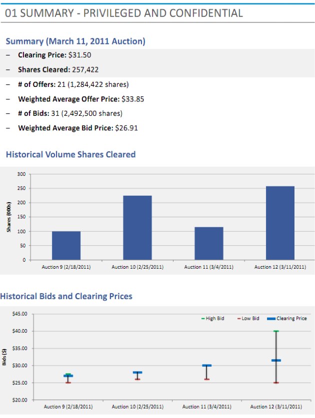 Next week’s auction will require a minimum sale and minimum purchase of 10,000 shares. If you are bidding for fewer than 100,000 shares, you are required to open a brokerage account with SecondMarket. Please email accounts@SecondMarket.com to receive a Brokerage Account Opening Form and return the completed form by Monday, March 7, 2011 at 5:00 PM EST.
