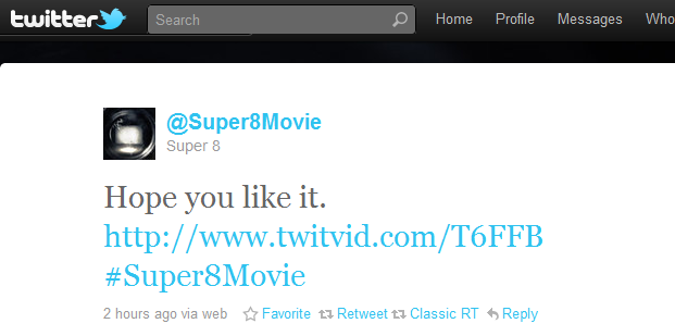 “With Twitter, fans are able to foster a real time conversation in a communal viewing environment and we wanted people everywhere to have the chance to discover the SUPER 8 trailer here first.”