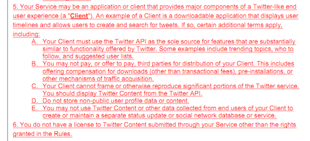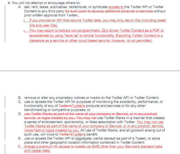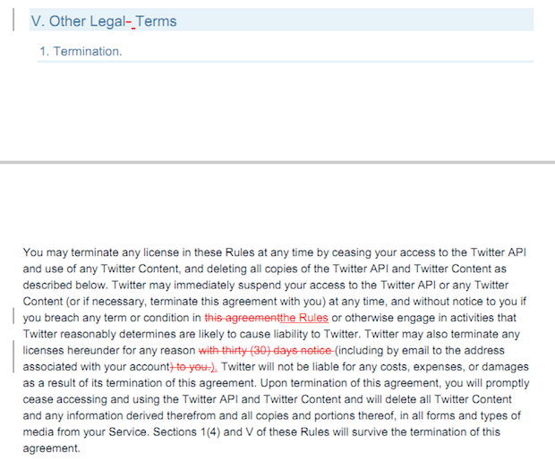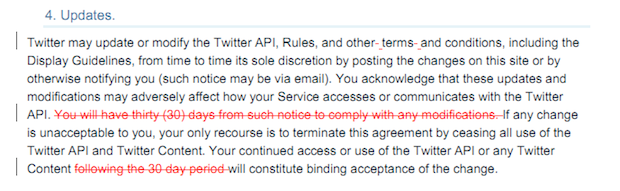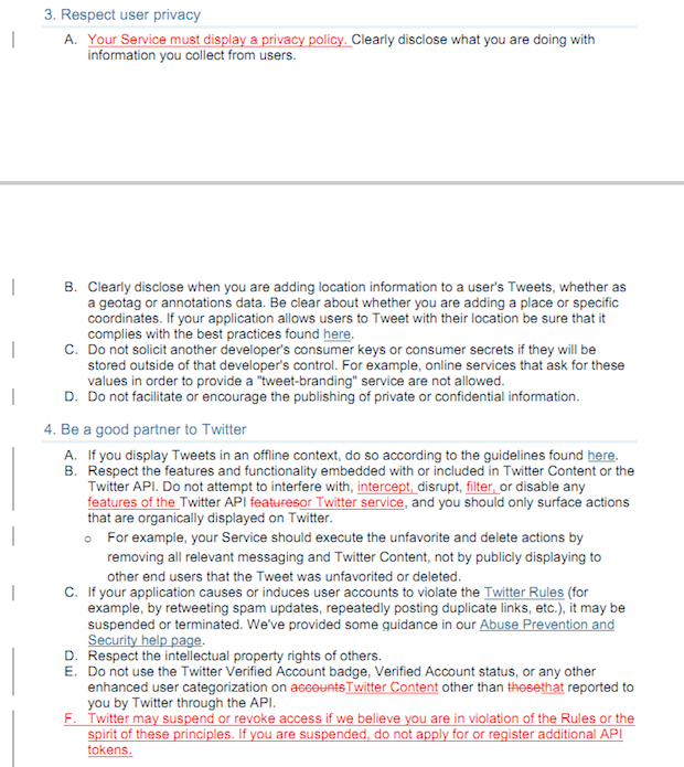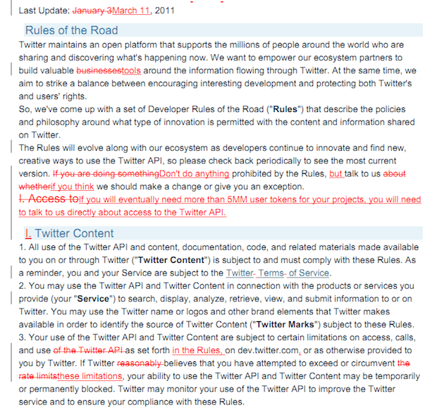 In making these changes, Twitter also had to chance their API Terms of Service. And we thought it would be interesting to compare the old ToS to the new one. We can do that thanks to the magic of Google, which has a cached copy of the ToS dated January 3, 2011.