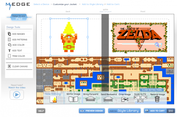 This is pretty cool if you’re at all the type who puts stickers and graphics on your devices. Pick your device (iPad, Kindle 2 or 3, or Nook), add some pictures, patterns, text, and so on and you’ve got yourself a case like no other. As you can see, I’ve gone all Zelda on mine.