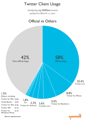 Sysomos analyzed 25 million Tweets last Friday and found that 58 percent of Tweets were sent from official Twitter apps, and 42 percent of Tweets were sent from third-party clients (or non-official Twitter apps). The analytics company highlights the trend that third-party clients are losing marketshare to Twitter clients, as the communications platform expands its offerings, and acquires third-party clients. In June 2009, a Sysomos report showed that 55 percent of Tweets were made using non-official apps, and as we learned, that number has dropped to 42 percent.