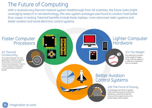 GE developed a prototype substrate from its Nanotechnology Advanced Technology Program that can improve electronic cooling significantly. Also, when compared to copper, GE’s substrate is a quarter the weight, spreads heat twice as fast, and can operate at 10x the force of gravity. It’s been known that material science would be a huge factor in furthering Moore’s law, and if the science turns out, it looks as though GE has quite a head start.